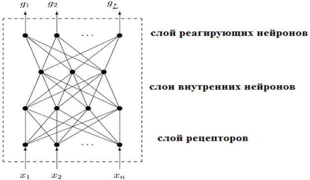 В их число входит слой входных рецепторов, подающих сигналы на нейроны из внутренних слоёв. Слои внутренних нейронов осуществляют преобразование сигналов. Слой реагирующих нейронов производит окончательную классификацию объектов на основании сигналов, поступающих от нейронов, принадлежащих внутренним слоям. Обычно соблюдаются следующие правила формирования структуры сети.