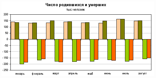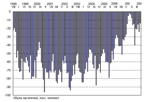 Сокращение численности населения происходило из-за естественной убыли населения, которая в январе-июле 2009г. уменьшилась по сравнению с соответствующим периодом 2008г. на 86,7 тыс.человек. Миграционный прирост на 82,9% компенсировал численные потери населения.
