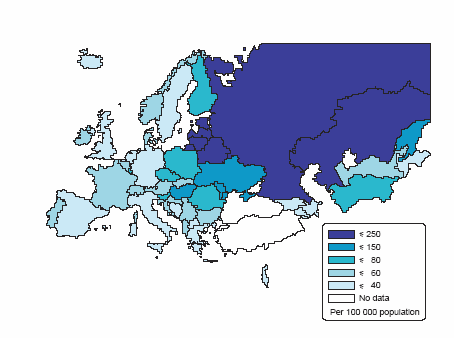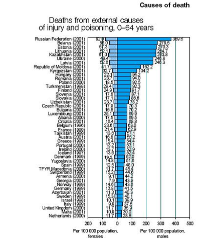 РФ имеет худшие в Европе показатели смертности от внешних причин (травмы и отравления) как в целом, так и для мужчин и женщин в возрасте 0 – 64 г.
