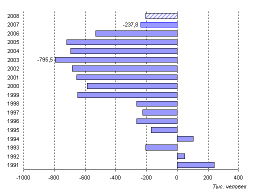Прирост (убыль) населения России, 1991-2008 годы