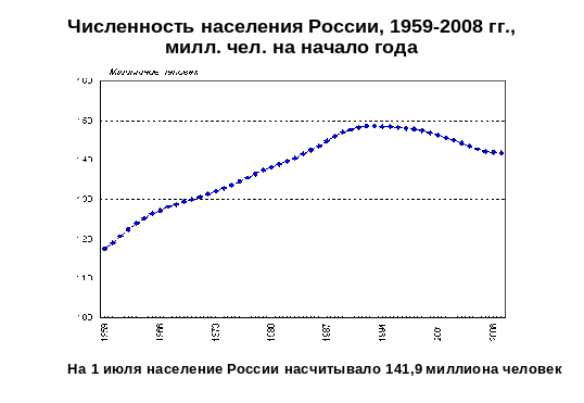 Согласно данным текущего учета, скорректированным по результатам переписи 2002 года, число постоянных жителей России достигло своей наибольшей величины - почти 148,6 миллиона человек - к началу 1993 года, после чего стало сокращаться. В 2008 г. число россиян примерно такое же, как в середине 1980-х годов.