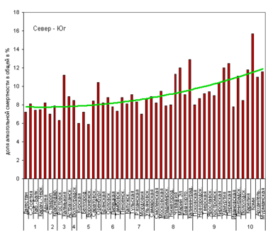 Связанная с алкоголем смертность в регионах европейской части России, расположенных с юга на север (цифры - номера долготных поясов) 2005 г.