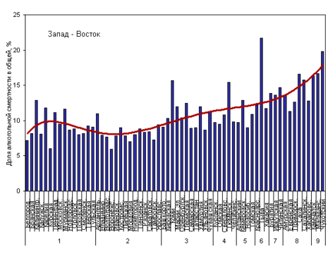Связанная с алкоголем смертность в регионах европейской части России, расположенных с запада на восток (цифры - номера широтных поясов) 2005 г.