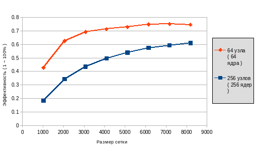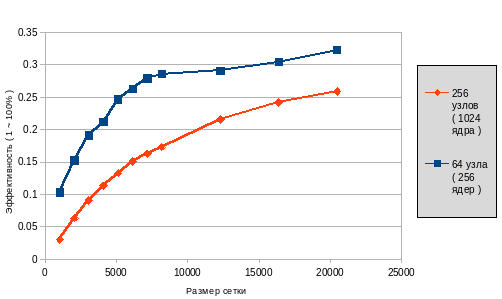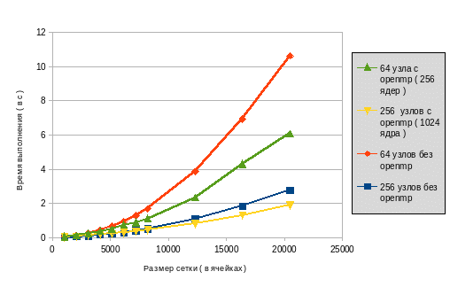 Наконец, третий внутренний цикл представляет собой модифицированный обратный ход метода прогонки и также может выполняться лишь последовательно. На Рис. 7 приведено соотношение времени работы программы c использованием openmp ( версия, использованная во всех остальных тестах ) и программы, откуда использование openmp было удалено. Для последовательной версии алгоритма данные не приводятся, т. к. последовательная версия алгоритма не использует openmp по определению. На Рис. 8 и Рис. 9, однако, приводятся графики ускорения алгоритма без openmp на 64, 256 узлах по сравнению с последовательным вариантом ( Для сеток больших размеров, которые не были рассчитаны последовательным алгоритмов, используется линейная интерполяция для установления возможного времени вычисления последовательным алгоритмов. Сетки такого размера в умещаются в оперативную память ) а также их эффективность относительно пиковой производительности системы.