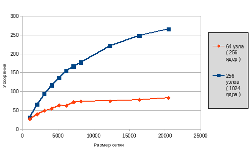Если говорить более конкретно, то на обработку одного столбца на одном шаге по времени уходит ~N операций на формирование СЛАУ и ~3 * N операций на решение этой СЛАУ методом прогонки. Используя P процессоров, мы получим ~N/P + 6 * N / P операций, которые необходимо выполнить последовательно. Это означает 7 * N / P операций по сравнению с 4 * N для последовательного алгоритма. То есть ускорение последовательного алгоритма на 64 узлах составило бы 36.57142... . Реальное ускорение несколько больше, т. к. операции формирования СЛАУ имеют большую вычислительную сложность, особенно в сравнении с вычислением значений неизвестных на последнем этапе метода прогонки. Еще одним источником ускорения являются N ^ 2 операций по определению граничных условий в начале каждого шага по времени, которые также распараллеливаются на p процессоров.