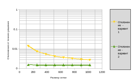 Применяется два варианта расчётной сетки. Их суть изложена на Рис. 1 и Рис. 2 выше. Левый и правый столбцы, верхняя и нижняя строки соответствуют границе исследуемой области. Зеленый прямоугольник — область, для которой производится непосредственный расчёт ( на изображениях параметр размера расчётной сетки в первом случае равен 4, во втором — 2 ). Все остальные прямоугольники обозначают области, значения в которых рассматриваются как граничные условия. Полностью корректной является первая схема, однако вторая обладает интересными свойствами погрешности. Для проверки корректности достаточно взять значения в конкретных точках с конкретного шага по времени и сравнить их со значением точного решения при тех же параметрах. Коэффициенты ρ, с, λ, смысл которых заключается в физических характеристиках материала, в котором рассматривается теплопроводность, приравниваются к единице для более простой верификации. На Рис. 3 изображено отклонение от точного решения на 100-ом шаге по времени ( параметр t = 0.01, то есть рассматривается момент времени 1.0 ) согласно результатам работы верификатора на сетках размера 128, 256, 384, 512, 640, 768, 1024, для первого и второго варианта расчётов. Погрешность вычисляется как среднее отклонение вычисленного решения от истинного значения в данной точке. Эти значения также совпадают с точностью до машинного нуля для последовательной и параллельной версий алгоритма. Поэтому соответствующий график интереса не представляет и не приводится. Интересный вывод заключается в том, что хотя погрешность 1 варианта уменьшается со сгущением сетки и уже на сетке 2048 * 2048 должна быть, по крайней мере, сопоставима с погрешностью второго варианта ( которая почти не зависит от размера сетки ), второй вариант обеспечивает хорошую точность на сетках малого размера. В дальнейших расчётах, однако, используется первый вариант.