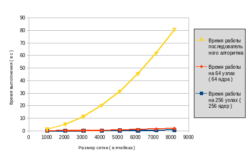 К сожалению, последовательное решение на Blue Gene / P при более-менее значительных размерах сеток выполняется долго, вплоть до выхода за лимит времени. Поэтому последовательный алгоритм запускается для малого числа шагов по времени, а параллельный алгоритм — для большего числа шагов по времени. В качестве основной меры времени выполнения, эффективности итп. программы используется среднее время выполнения одного шага, получаемое простым арифметическим делением общего времени выполнения на количество
