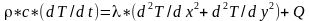 где T – температура, зависит от x, y, t; Q – функция, характеризующая дополнительные источники тепловыделения, зависит в общем случае от x, y, t, T. X, Y – декартовы координаты, t – время. ρ, с, λ – параметры, характеризующие «материал» области, в которой рассматривается уравнение теплопроводности. При решении задаётся размер сетки и количество шагов по времени. При этом сам размер поля остаётся неизменным.