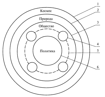 1 – космос; 2 – природа; 3 – общество; 4 – отдельные сферы общества (экономика, право, мораль и др.); 5 – отдельные общественные явления; 6 – политика.