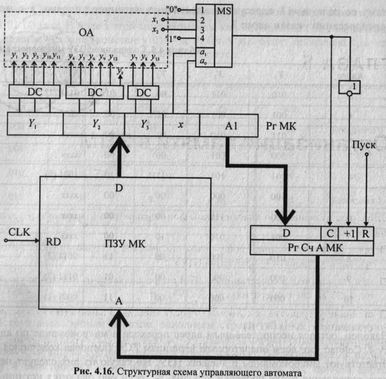 Наконец, остался неопределенным адрес перехода в микрокоманде по адресу 4. Сейчас уже всем операторным вершинам ГСА (включая конечную) соответствуют микрокоманды в ячейках ПЗУ. На какую из них следует передать управление после проверки условия х2, если оно окажется истинным? Из ГСА видно, что тогда следует проверить условие х^ — случай двух подряд расположенных условных вершин. Передать управление на адрес 0, где проверяется это условие? Но тогда выполнятся и микрооперации ух, у4, у7, а это микропрограммой не предусмотрено. Очевидно, в микропрограмму следует включить дополнительно микрокоманды (в нашем случае — по адресам 9 и 10), которые не формируют никаких микроопераций, а обеспечивают только передачу управления. Первая осуществляет условный переход по переменной на адрес 7, вторая' (которая будет выполняться только при =0)— безусловно на адрес 1. Теперь код микропрограммы полностью сформирован.Осталось изобразить структурную схему разработанного управляющего автомата (рис. 4.16).