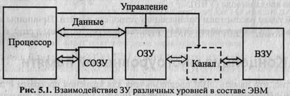 В основе большинства ЭВМ лежит трехуровневая организация памяти: сверхоперативная (СОЗУ) — оперативная (ОЗУ) — внешняя (ВЗУ). СОЗУ и ОЗУ могут непосредственно взаимодействовать с процессором, ВЗУ взаимодействует только с ОЗУ.