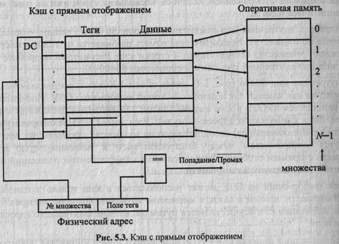 Кэш-память с прямым отображением требует минимальных затрат оборудования (по сравнению с другими вариантами организации кэш), но имеет минимальную вероятность кэш-попаданий. Суть организации (рис. 5.3) состоит в следующем. Физическая оперативная намять разбивается на блоки (множества) одинакового размера, количество которых (блоков) соответствует числу ячеек кэш, причем каждой строке ставится в соответствие определенное множество ячеек памяти, не пересекающееся с другими. Все ячейки множества претендуют на одну строку кэш.