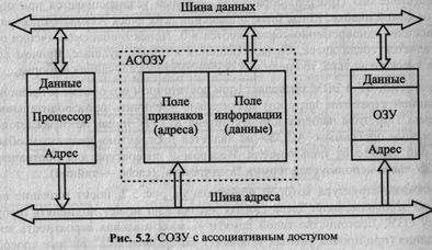 Способ использования АЗУ в качестве сверхоперативного иллюстрирует рис. 5.2. В информационном поле ячеек АСОЗУ— копия информации некоторых ячеек ОЗУ, а в поле признаков — адреса этих ячеек ОЗУ. Когда процессор генерирует обращение к ОЗУ, он одновременно (или прежде) инициирует процедуру опроса АСОЗУ, выдавая в качестве признака адрес ОЗУ. Если имеет место совпадение признака ячейки с запрашиваемым адресом (не более одного раза, алгоритм загрузки АСОЗУ не предусматривает возможности появления одинаковых признаков), то процессор обращается (по чтению или по записи) в информационное поле этой ячейки АСОЗУ, при этом блокируется обращение к ОЗУ. Если требуемый адрес не найден в АСОЗУ, инициируется (или продолжается) обращение к ОЗУ, причем в АСОЗУ создается копия ячейки ОЗУ, к которой обратился процессор. Повторное обращение процессора по этому адресу будет реализовано в АСОЗУ (на порядок быстрее, чем в ОЗУ).
