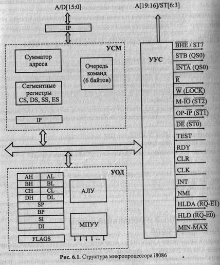 Структурная схема микропроцессора i8086 представлена на рис. 6.1. Микропроцессор включает в себя три основных устройства: