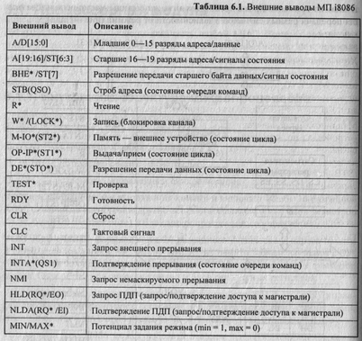 В табл. 6.1 приведено описание внешних выводов МП i8086. При описан выводов косой чертой (/) разделены сигналы, появляющиеся на выводе в ра ные моменты машинного цикла. В круглых скобках указаны сигналы, хар-терные только для максимального режима. Символ * после имени сигнала знак его инверсии.