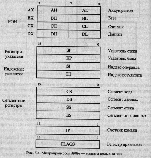 Помимо операций с 16-разрядными регистрами общего назначения (РОН) АХ — DX, допускается обращение к каждому байту этих регистров: AL — DL, АН — DH. В процессорах семейства х86 система команд построена таким образом, что в некоторых командах РОН выполняют определенные по умолчанию функции счетчиков, индексных регистров, источников адреса и др.