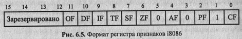 16-разрядные регистры BP, SI, DI используются для образования исполнительных адресов памяти, SP — указатель стека, IP — программный счетчик (СчК), Flags — регистр флагов, формат которого приведен на рис. 6.5, где: