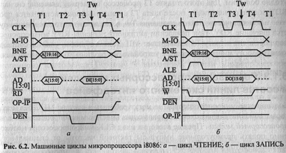 По большому счету разнообразие МЦ сводится к двум разновидностям — чтению (данные или команды принимаются в процессор) и записи (данные выдаются из процессора). Временные диаграммы соответствующих МЦ приведены на рис. 6.2.