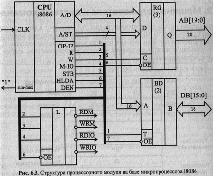 Микропроцессор i8086 реализован по n-МДП-технологии, и его выходные каскады не обеспечивают достаточной нагрузочной способности для линий системного интерфейса. Поэтому к выходным линиям микропроцессора обычно подключают буферные схемы BD, реализованные по технологии ТТЛ. Кроме того, шины адреса и данных в i8086 мультиплексированы. Адрес удерживается на выводах микропроцессора только в течение одного такта машинного цикла, а использоваться должен весь МЦ. Поэтому адрес необходимо запомнить в специальных внешних регистрах-защелках RG (которые, кстати, играют и роль буферной схемы шины адреса).