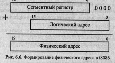 Таким образом, размер каждого сегмента в i8086 составляет 216 байтов = = 64 Кбайт. Положение сегмента в адресном пространстве (его начальный адрес) определяется содержимым одноименного сегментного регистра. Формирование физического адреса иллюстрируется на рис. 6.6, из которого видно, что граница сегмента в адресном пространстве может быть установлена не произвольно, а таким образом, чтобы начальный адрес сегмента был кратен 16.