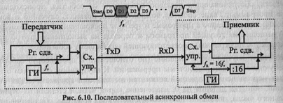 Режим "О" является синхронным и во многом напоминает рассмотренный выше механизм обмена с использованием регистров. Рассмотрим подробнее процесс асинхронного обмена в режиме "1".
