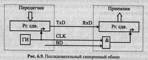 При синхронном методе передатчик генерирует две последовательности — информационную TxD и синхроимпульсы CLK, которые передаются на приемник по разным линиям. Синхроимпульсы обеспечивают синхронизацию передаваемых битов, а начало передачи отмечается по-разному. При организации внешней синхронизации (рис. 6.9) сигнал начала передачи BD генерируется передатчиком и передается на приемник по специальной линии.