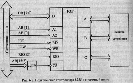 Типичным примером такой БИС может служить программируемый контроллер параллельного обмена (далее "контроллер") 8255А (отечественный аналог — К580ВВ55).