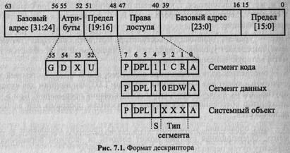 Дескриптор— это 8-байтовый блок, содержащий атрибуты области линейных адресов — сегмента. Дескриптор включает в себя информацию о положении сегмента в линейном адресном пространстве, размере сегмента, типе информации, хранящемся в сегменте и правах доступа к ней, а также другие атрибуты сегмента. Формат дескриптора представлен на рис. 7.1.