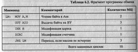 Таким образом, для того чтобы в рамках процедуры копирования массива данных переслать из памяти в ВУ один байт данных, потребуется десять машинных циклов. Процессоры с более совершенной системой команд (например, jc86) могут использовать для этой цели меньшее число МЦ, но все равно их будет более одного.