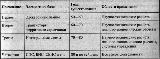 Изделия современной техники, особенно вычислительной, традиционно принято делить на поколения (табл. 1.1), причем основным признаком поколения ЭВМ считается ее элементная база. Следует помнить, что любая классификация не является абсолютной. Всегда можно отыскать объект классификации, который по одним параметрам относится к одному классу, а по другим — < другому. Это в большой степени относится и к классификации поколений ЭВМ: некоторые авторы выделяют три поколения ЭВМ (дальнейшее развитие ЭВМ идет как бы вне поколений), другие насчитывают целых шесть.
