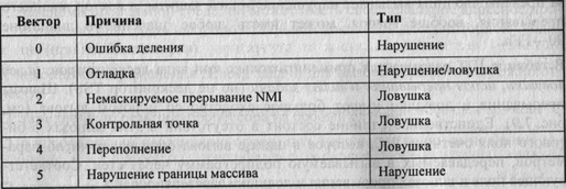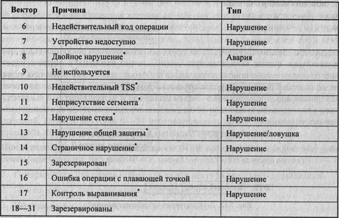 Точное значение адреса возврата зависит от того, является ли особый случай нарушением, ловушкой или аварией. Первые 32 вектора зарезервированы за особыми случаями Р-режима (табл. 7.1).