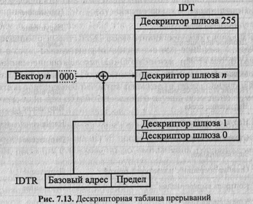 □ таблица векторов прерываний трансформирована в дескрипторную таблицу прерываний IDT (рис. 7.13);