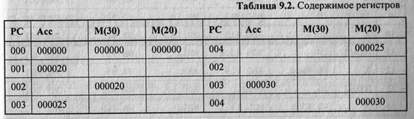 Введем полученные коды последовательно в ячейки ОЗУ, начиная с адреса 000. Выполняя команды в режиме Шаг, будем фиксировать изменения программно-доступных объектов (в данном случае это Асе, PC и ячейки ОЗУ 020 и 030) в табл. 9.2.