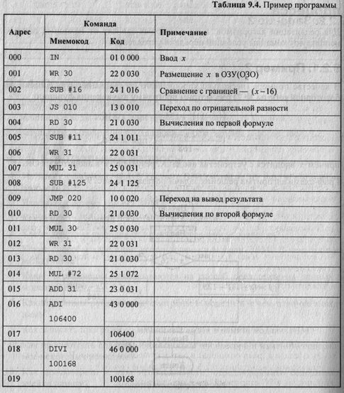 Распределение памяти таково. Программу разместим в ячейках ОЗУ, начиная с адреса 000, примерная оценка объема программы — 20 команд; промежуточные переменные: At — в ячейке ОЗУ с адресом 030, к — по адресу 031, S — по адресу 032. ГСА программы показана на рис. 9.2, текст программы с комментариями приведен в табл. 9.7.