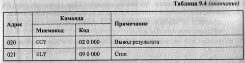 Оценив размер программы примерно в 20—25 команд, отведем для области данных ячейки ОЗУ, начиная с адреса 030. Составленная программа с комментариями представлена в виде табл. 9.4.
