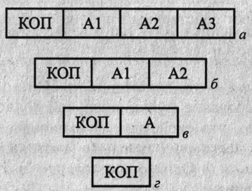 Рис. 2.1. Форматы команд: а — трехадресный; б — двухадресный; в — одноадресный;
