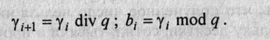 3. Остаток от деления целочисленно разделить на gm~2, результат деления принять за вторую цифру нового числа; найти остаток; продолжать эту последовательность действий, пока показатель степени q не достигнет значения 0.