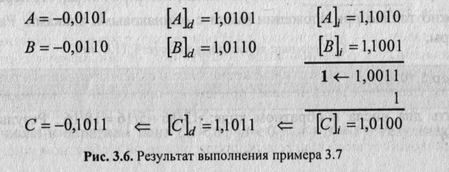 Сложить два числа в обратном коде (случай 4). Результат — на рис. 3.6.