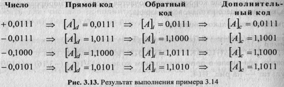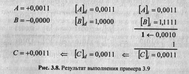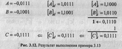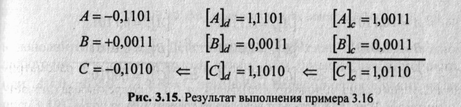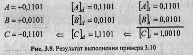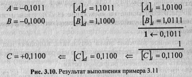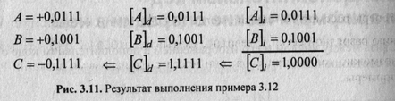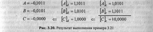 слагаемых пример 3.12 может относиться как к обратным, так и к дополнительным кодам, но преобразование результата— дополнительного кода в прямой приведет к другому значению. Действительно,
