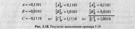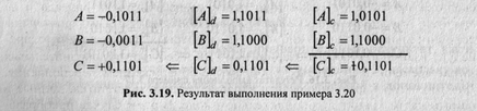 Сложить два числа в дополнительном коде: (-11/16) + (-8/16) = (-19/16). Результат — на рис. 3.19.