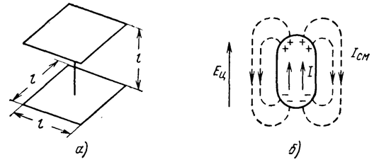 Применимость этой модели к рассматриваемому случаю основана на том, что при l<<λ, независимо от формы и ориентации тела, наведенный ток возбуждается в фазе на всей его поверхности и замыкается током смещения через окружающее пространство.