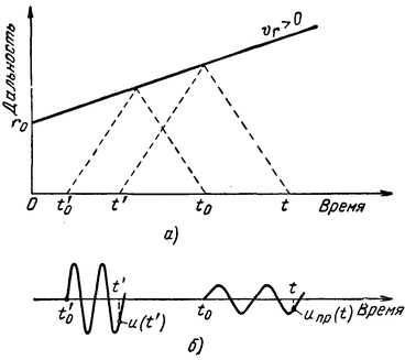 Если дальность до блестящей точки измеряется в момент времени (t0+t0′)/2, соответствующий началу ее облучения, то запаздывание принимаемых колебаний относительно излучаемых равно