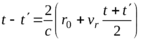 Аналогично, запаздывание, соответствующее дальности до цели в момент времени (t+t′)/2, где t – момент приема колебаний, а t′ – момент излучения, будет