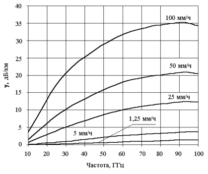 В диапазоне частот от 6 до 200 ГГц затухание в дожде может оказаться существенным.