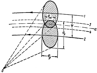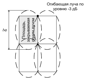 Однако в реальности ДНА имеет в общем случае форму эллипса в сечении, соответственно необходимо учитывать перекрытия диаграммы направленности на смежных участках траектории (при непрерывном вращении) (рисунок 3) и смежных положениях луча (рисунок 4) (при дискретных переключениях).