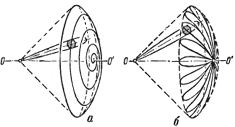 Рисунок 6 – Траектория движения ДНА при спиральном обзоре: скорость переносного движения больше скорости относительного движения (а) и скорость переносного движения меньше скорости относительного движения (б)