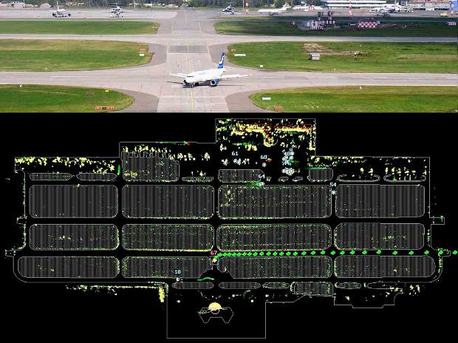 Это совмещенный вид обзора из диспетчерской вышки и обработанного изображения на экране радиолокационного терминала, наложенного на электронную карту аэропорта.