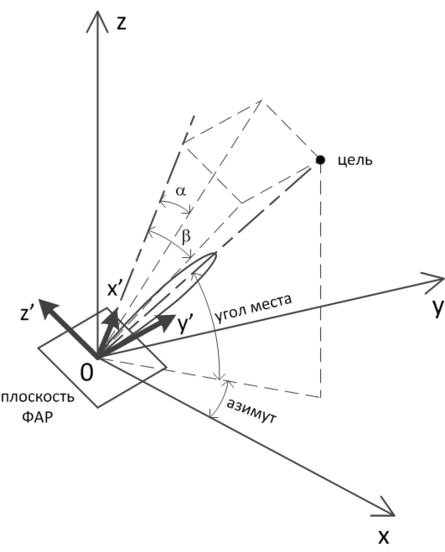 В этой системе координат отклонение луча всегда составляет не больше ±45˚ от каждой плоскости, и регулируется соответствующим наклоном антенной решетки в вертикальной плоскости для больших секторов по углу места (> 45˚).