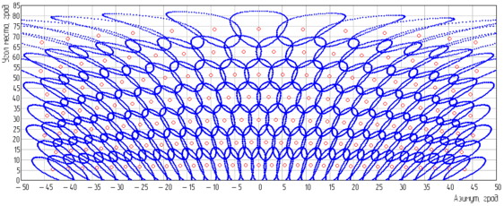 На рисунке 15 показан пример расстановки лучей с учетом изменения ширины ДНА при отклонении луча в горизонтальной и вертикальной плоскости.