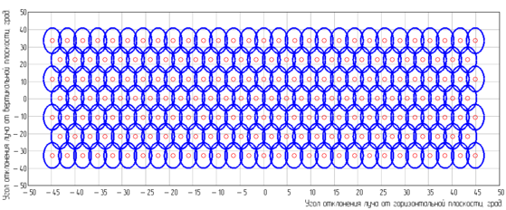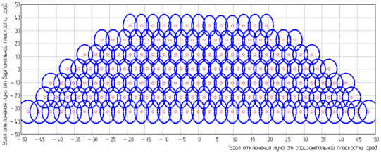 На рисунке 14 приведен пример заполнения лучами сектора обзора, представляющего собой ±45 градусов по азимуту и ±40 градусов по углу места в биконической системе координат.